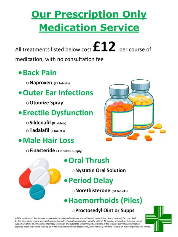 All the medications listed above are prescription only medications or strengths and/or quantities. Hence, they can only be prescribed by the pharmacist after a direct private consultation with the patient. All supplies are made at the professional judgement of the pharmacist and subject to the terms and conditions of the relevant patient group direction.