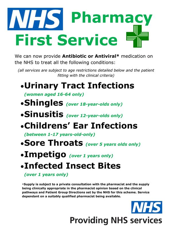 We can now provide prescription treatments for the range of conditions listed without the need to have a GP appointment. Restrictions apply. Please come in to the pharmacy to see the pharmacist as no appointment is needed. Please be aware that there may be a period of waiting if the pharmacist has other booked appointments to complete. Click below to complete our pre-treatment eligibility checker which will signpost you to the best treatment provider based on your symptoms. If this pre-consultation checker says you are eligible for treatment at the pharmacy, please either visit or contact the pharmacy to speak with our pharmacist.