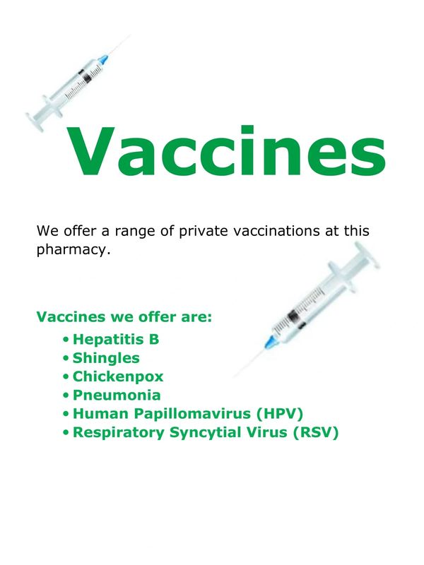 We can offer a range of vaccinations. Please see our price list below and call us or visit the pharmacy so we ensure that we have the vaccines you require in stock.